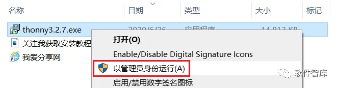 1.先使用“百度网盘客户端”下载THY327_CN软件安装包到电脑磁盘里,并解压缩,然后找到thonny3.2.7.exe,鼠标右击选择【以管理员身份运行】