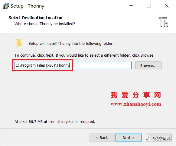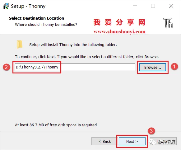 4.选择软件安装路径,默认安装在C盘,点击【Browse】可修改安装路径,注意:安装路径文件夹名称不能含有中文字符!小编这里将软件安装在D盘Thonny3.2.7文件夹下,然后点击【Next】