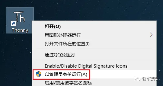 9.返回电脑桌面,找到Thonny图标,鼠标右击选择【以管理员身份运行】