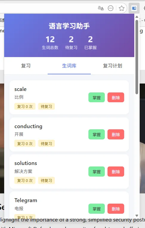 如果需要,还可以打开插件的复习界面,复习生词库里的单词,完成巩固。