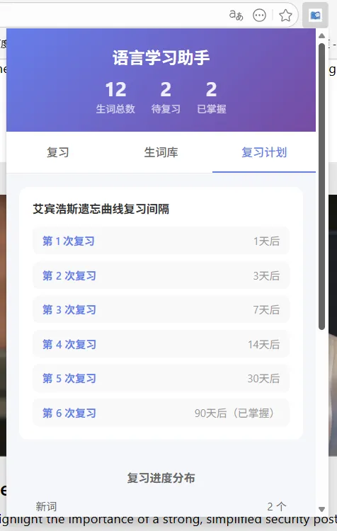 科学复习:插件后台会按照艾宾浩斯遗忘曲线,提醒你复习加入的生词,并生成复习记录和计划。