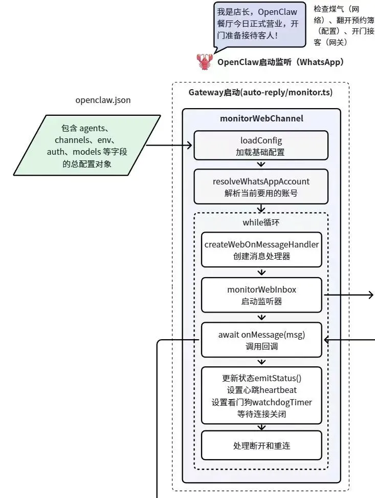 这就像餐厅经理早晨打开大门,检查各种设备是否正常,再接通前台、后厨、点单系统和出餐系统,点亮招牌,让 OpenClaw 处于营业状态,随时准备接客。没有这一层,后面所有智能都无从谈起。
