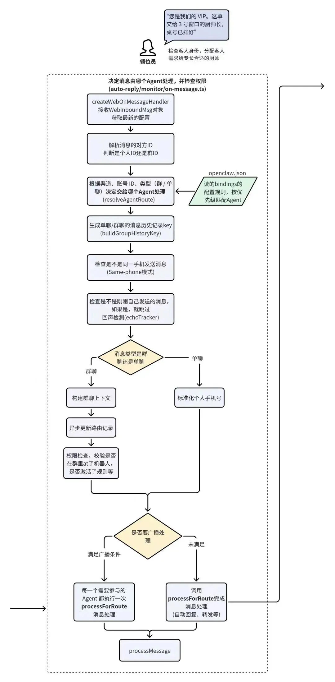 最终,当路由判断全部完成后,这条消息才会进入真正的处理函数 processMessage,传递给下一层处理。