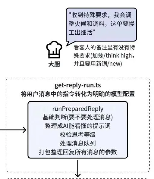 在源码中,这一层主要发生在 get-reply.ts。可以想象成厨师接到订单后,先确认几件事情:这桌客人是谁、以前来过没有、有没有忌口、今天厨房里有哪些食材、需要用哪个灶台。