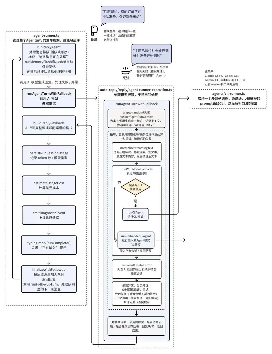 这部分源码主要在 auto-reply/reply/agent-runner-execution.ts 中,核心入口来自上一步调用的runAgentTurnWithFallback。从这个函数名能猜到,这一层的核心任务,是在真正调用模型之前,先把整次 AI 执行包装成一个可重试、可切换、可恢复的运行过程。如果继续用餐厅来打比方,第七步是主厨终于走到灶台前,一手拿锅铲、一手拿灭火器,确保等会儿做菜时别出事。