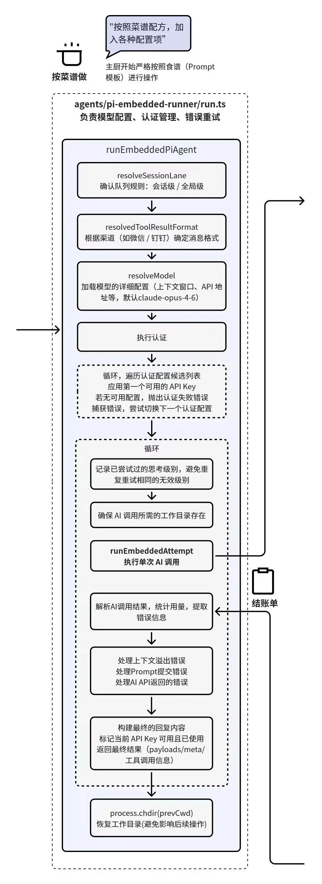 前一步里,主厨已经完成了最后的开炒准备:确认走哪条执行路径、决定是不是用 CLI、是不是走嵌入式 Agent、这次运行有没有备用方案、出错后如何重试。换句话说,锅、火、食材、菜谱、备用灶都已经确认完毕。接下来,真正负责做菜的,就是 agents/pi-embedded-runner/run.ts 这一层的 runEmbeddedPiAgent。
