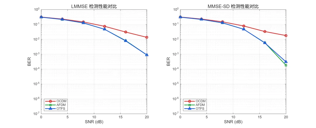 结论:在当前配置下,AFDM 与 OTFS 在中高 SNR 区间显著优于 OCDM;MMSE-SD 相对 LMMSE 的增益在高 SNR 更明显。