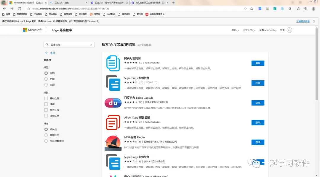 使用浏览器插件,电脑上安装的谷歌浏览器或者Win10自带的Microsoft Edge浏览器,打开浏览器中的扩展,搜索百度文库,就会出现插件,随便下载一个,安装好插件,将插件显示在工具栏中,之后就可以操作了。