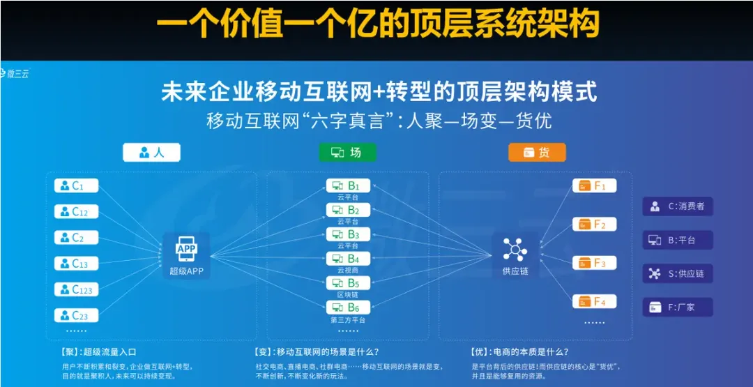 传统电商将商城、用户、供应链紧密捆绑,一旦某个环节出现问题,整个平台都可能受到影响。而超级云 APP 采用人、货、场彻底分离的模式。