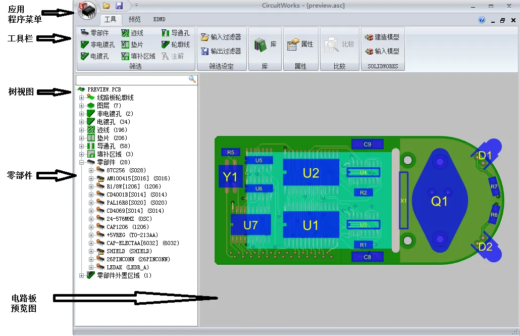 CircuitWorks同时拥有专门的用户界面和SOLIDWORKS界面。有些操作可以通过任一界面执行,例如打开ECAD文件。而其它操作则特定于某一个界面。