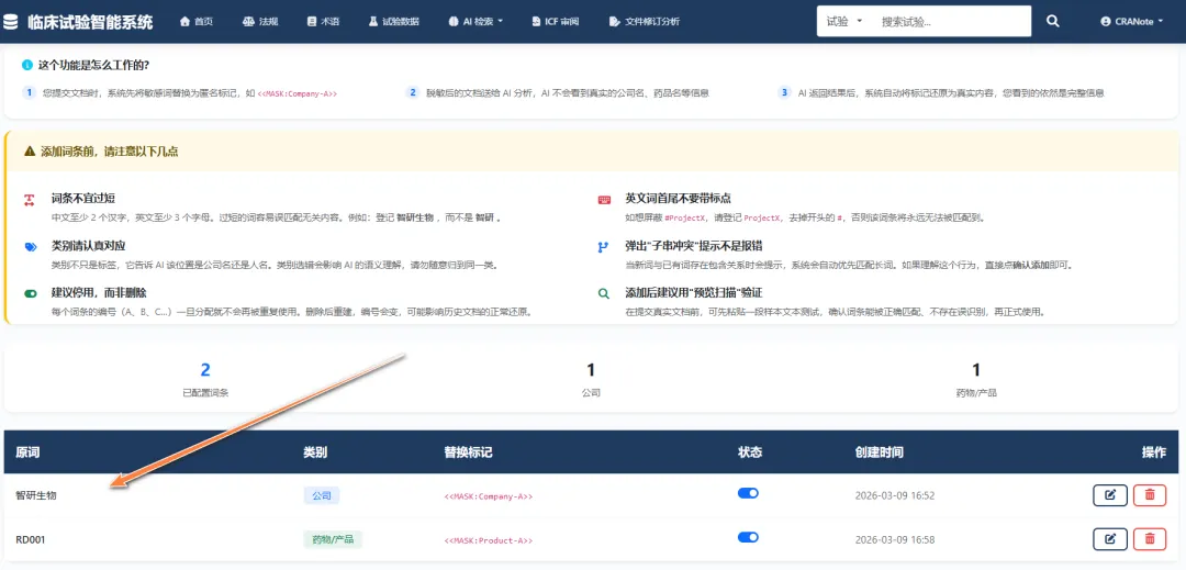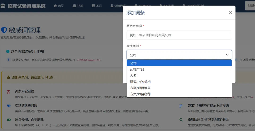 简单来说,就是大家可以提前设置一些敏感词,比如公司名称、产品名称、试验编号等。这样,文件在发送给大模型之前,会通过程序将这些真实的敏感词进行过滤,比如“智研生物公司”会被替换为<<MASK:Company-A>>, 产品“RD001”会被替换为<<MASK:Product-A>>。这样这些敏感词就不会发给大模型,同时也不会影响大模型分析。