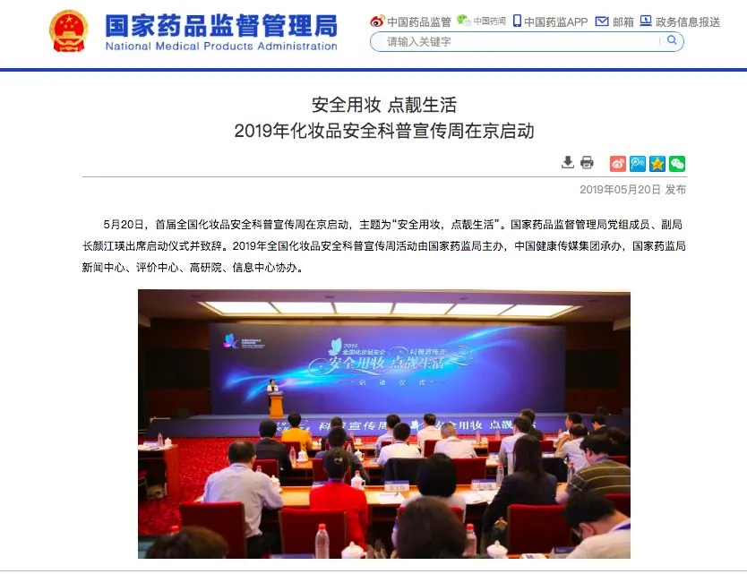 5月20日,国家药监局主办的首届全国化妆品安全科普宣传周在京启动,主题为“安全用妆,点靓生活”。