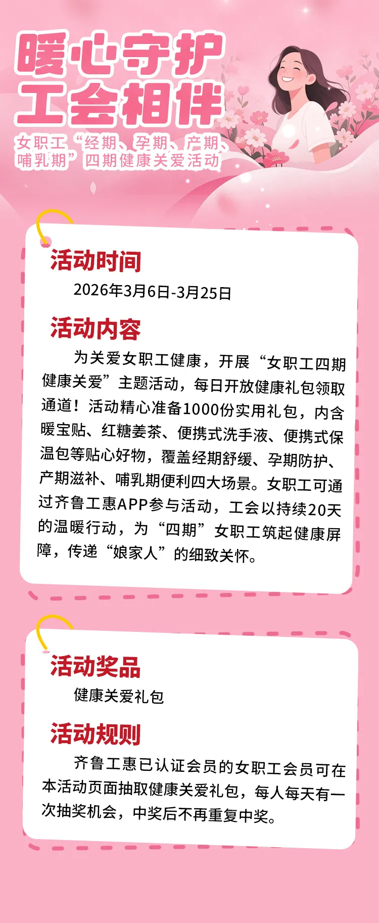 阳春三月,正值女职工维权行动月。青岛市总工会聚焦女职工身心健康呵护与合法权益保障两大核心,依托齐鲁工惠APP 平台精心策划系列线上有奖活动,以精准化服务传递工会组织的关怀与温情。进一步凝聚巾帼奋进力量,为谱写新时代高质量发展新篇章注入澎湃动能。