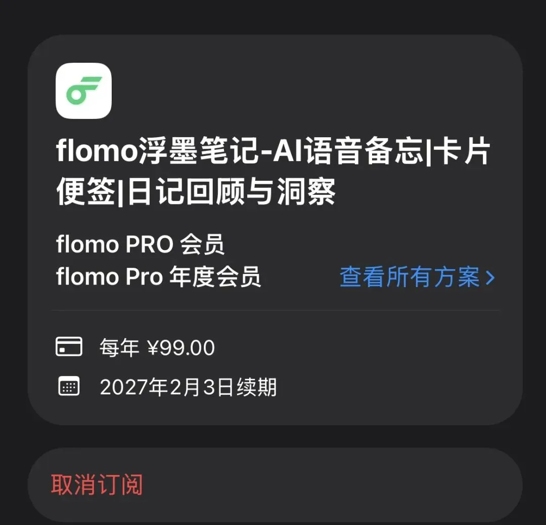 在加上年前在flomo软件上购买的一年会议99元。今天已经购买了两个软件服务了,可以预见flomo 软件的会员很可能在明年到期还得续费。