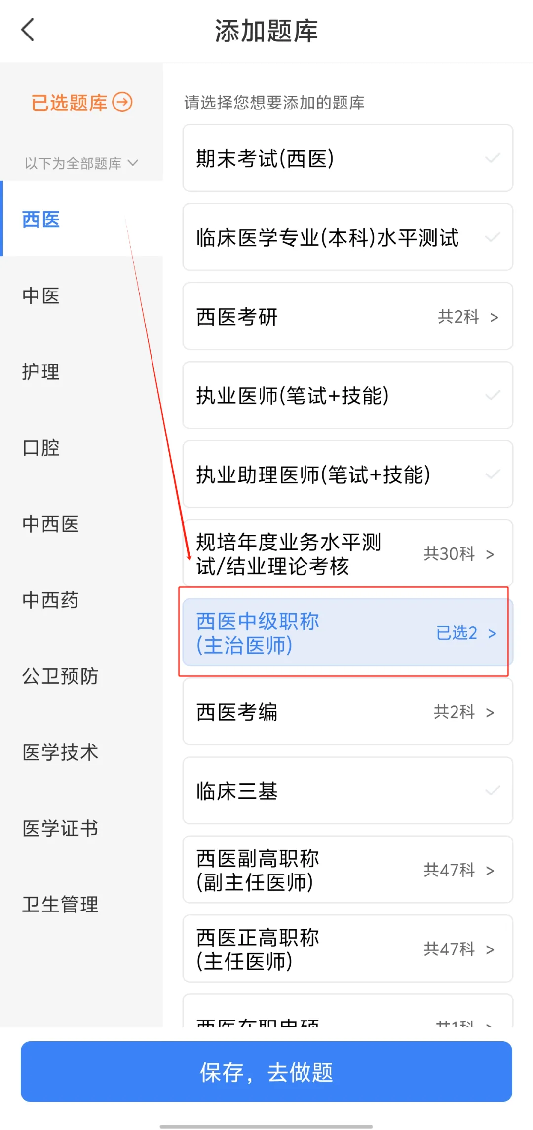 无需多于步骤,打开蓝基因APP【主页题库-右上角添加题库—选择西医—西医中级职称—选择对应科目】即可进入题库,点击即免费,点击即刷题!
