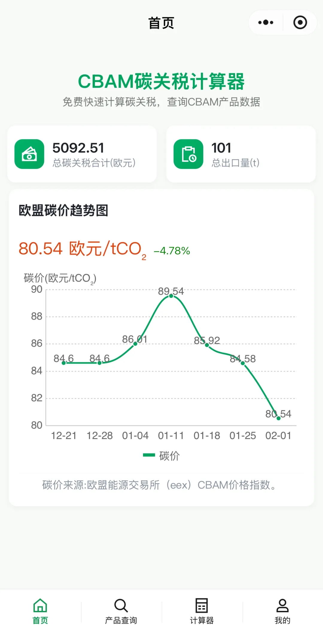 【首页】展示历史计算记录的总碳关税金额、总出口量及最近7周的周平均CBAM证书价格(碳价)(数据来源于欧盟能用交易所CBAM价格指数)。