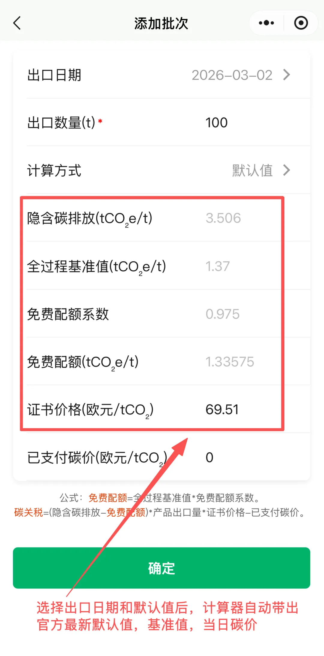 1、选用默认值计算:系统自动匹配最新官方发布的计算参数值,只需输入【出口日期】、【出口数量】(单位:吨)及【已支付碳成本】,即可完成计算;
