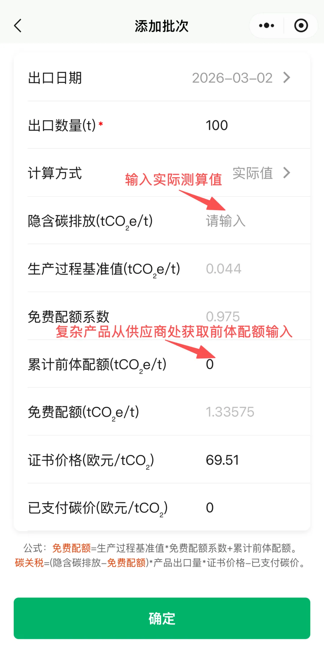 进入产品【添加批次】页面,选择产品的出口日期、出口数量和计算方式,小程序支持使用默认值或者实测值进行计算(计算公式已分别在页面底部列出):