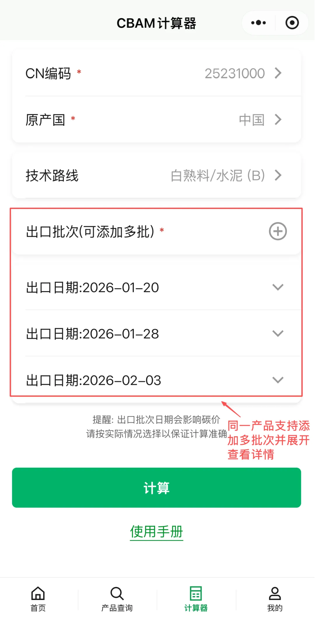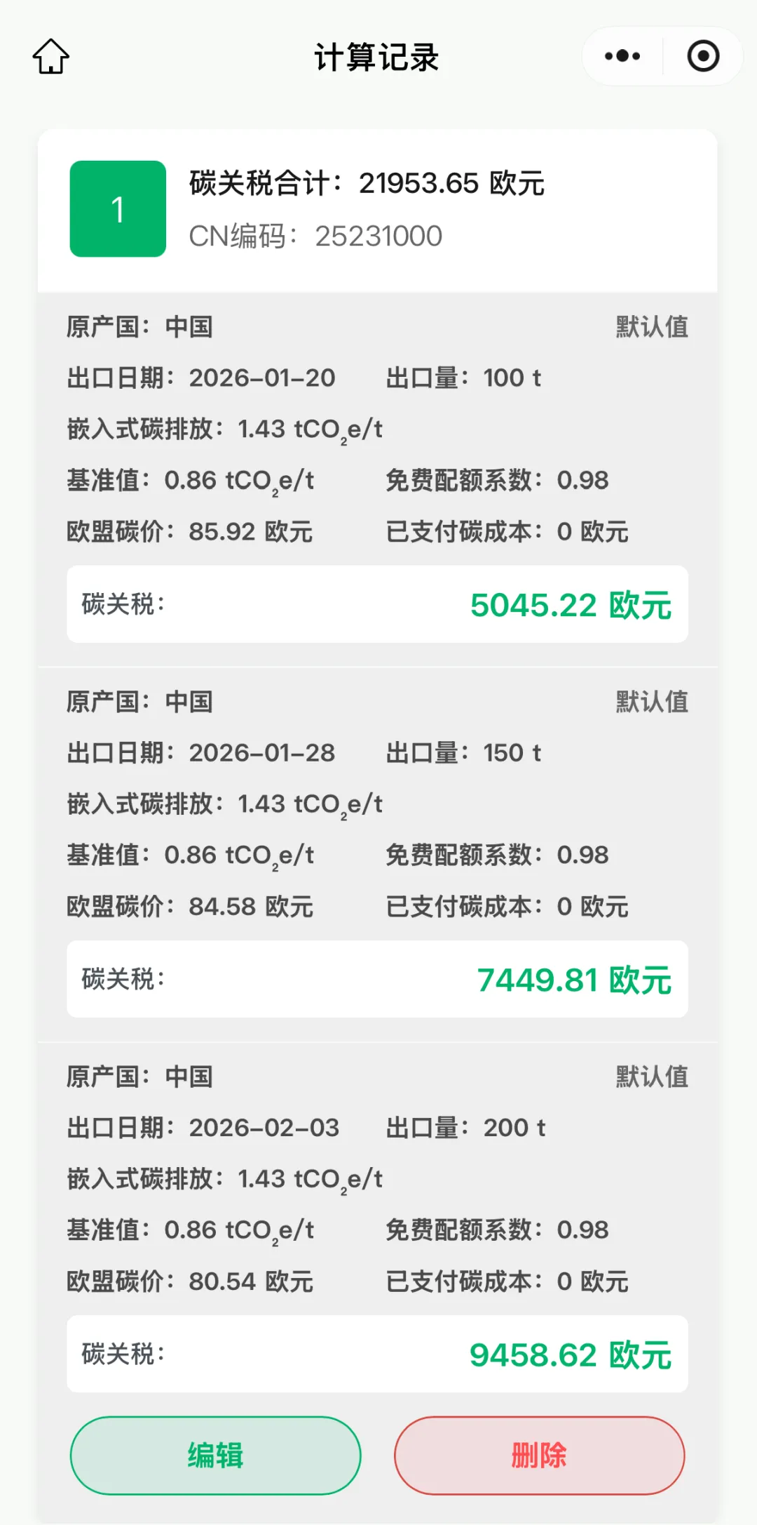 3、点击【计算】按钮,计算结果会显示在使用记录里,支持查看每一批次的碳关税成本及合计成本。