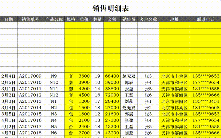 日常的销售数据,请在【销售明细表】中逐笔记录。表内标黄列的数据会根据录入的信息自动生成,无需手动填写。
