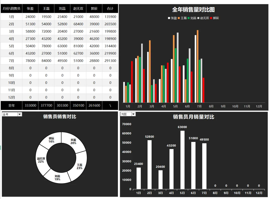 【销售图表分析】模块能将数据转化为直观的动态图表。您可以通过下拉菜单,灵活地分析全体或指定销售员的月度销售趋势与整体业绩表现。