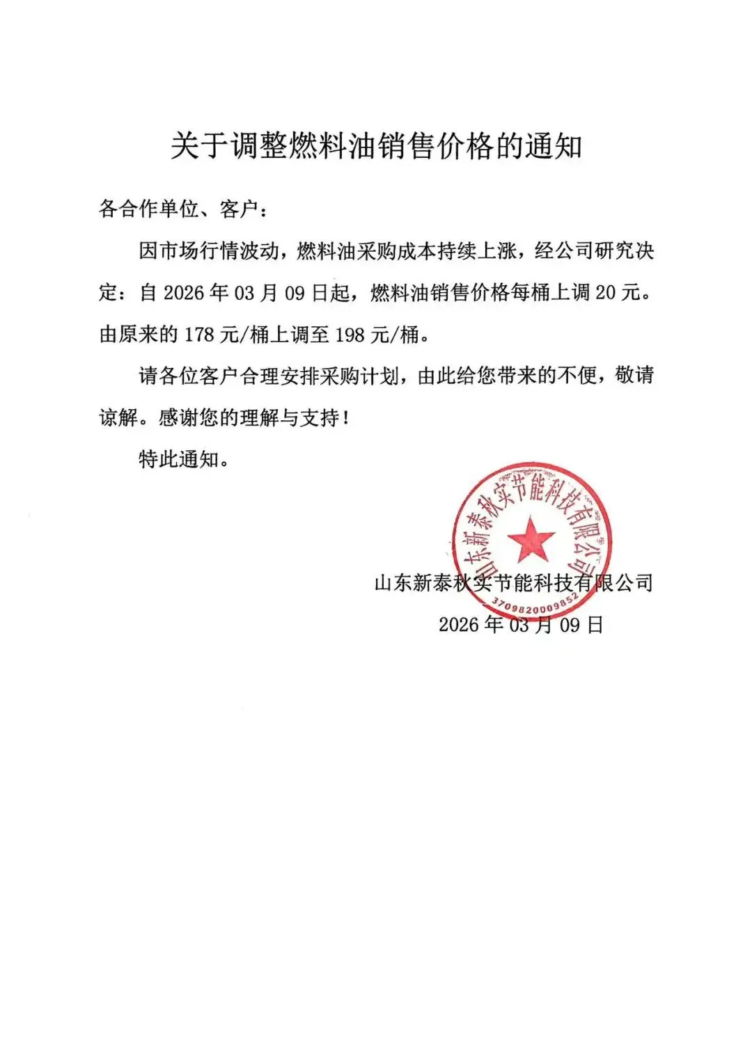 受近期国际形势剧烈变动,原材料市场价格持续走高的影响,公司不得不对产品价格进行适度调整:自即日起,公司燃油产品每桶售价上调20元(由原定178元/桶上调至198元/桶)。这20元的调整,并非商业策略的主动选择,而是成本传导的被动应对。我们比任何人都更希望维持原价,但我们更需要对每一位客户负责—只有保证产品品质的稳定、保证供应链的健康,才能不辜负您长久以来的信任。