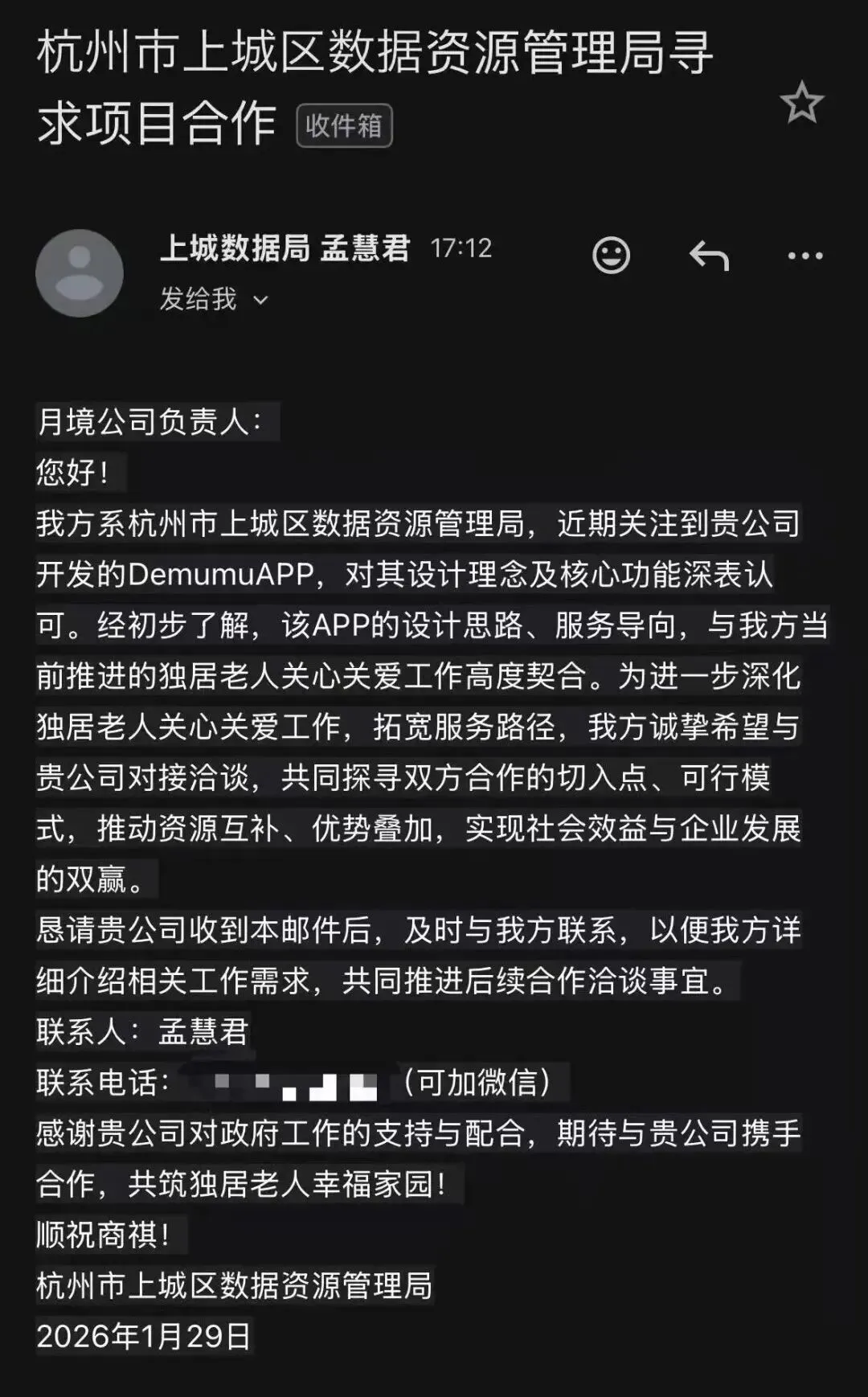 这封邮件没有空泛的政策推介,而是精准点出项目对独居群体的价值,更列明了上城深耕独居关爱场景的积淀与实打实的支持。而后续的服务,更让团队感受到上城的诚意:从提出设公司到注册落地仅用2天,半个月完成所有筹备,街道代办、部门快审、物业协调的全流程服务,让创业少了繁琐,多了高效。
