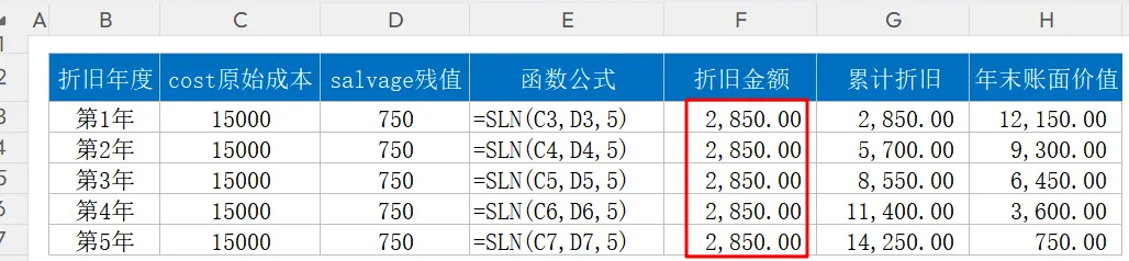 函数功能:平均计算资产每期折旧额函数语法:=SLN(资产原值, 资产残值, 使用期限)