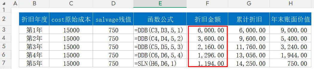 函数功能:加速折旧法,前期计提折旧多,后期计提折旧少函数语法:=DDB(资产原值, 资产残值, 使用期限, 当前期间, [折旧因子])