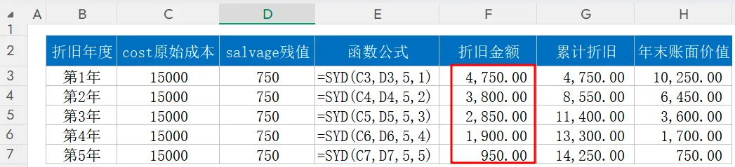 函数功能:按年数比例计算各期折旧额函数语法:=SYD(资产原值, 资产残值, 使用期限, 当前期间)