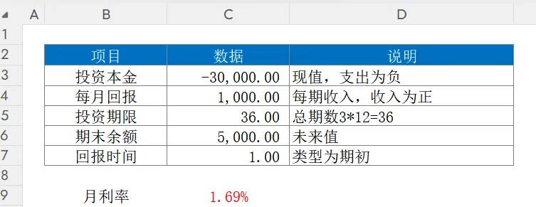 计算投资本金30000,投资期限36个月、每期期初收到1000元,期末余额为5000,该项投资对应的月回报率是多少。