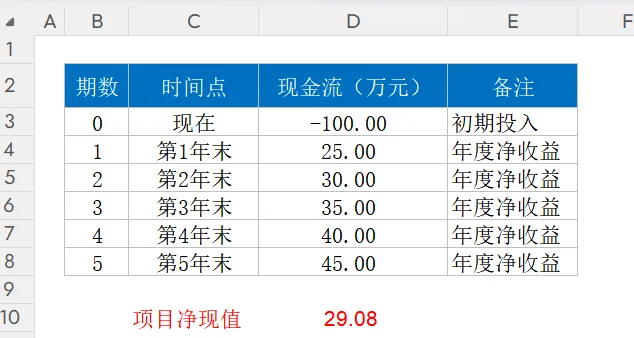 应用公式:初始投资100万元,折现率10%,计算定期现金流的净现值