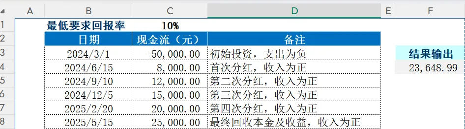 应用公式:初始投资5万元,折现率10%,根据具体日期对应现金流计算的净现值