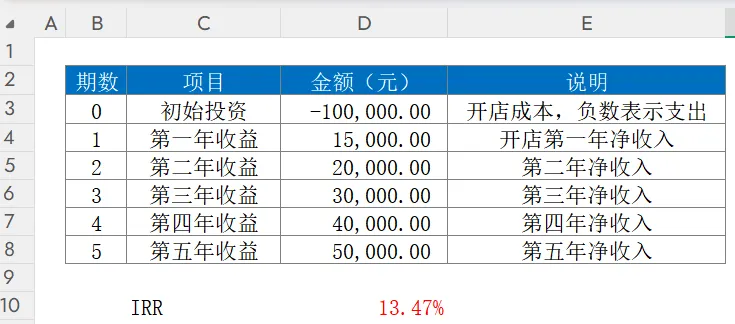 函数功能:计算定期现金流的实际收益率函数语法:=IRR(现金流范围, [猜测值])