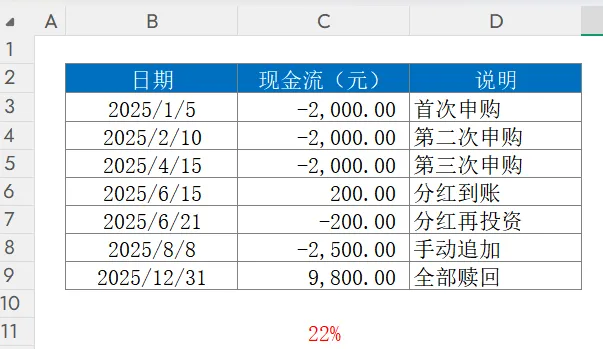函数功能:计算任意时间点现金流的实际收益率函数语法:=XIRR(现金流范围, 日期范围, [猜测值])