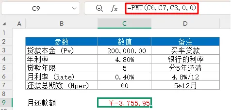 函数功能:计算贷款每期的总还款额(本金+利息)函数语法:=PMT(各期利率, 总付款期数, 贷款本金, [未来值], [付款时间])应用公式:假设贷款20万元买车,年利率4.8%,贷款5年,月末还款(等额本息),计算每个月需要还给银行多少钱(本金+利息)
