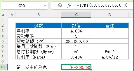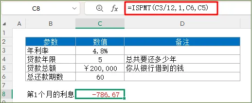 函数功能:计算等额本金还款方式下,某一期支付的利息函数语法:=ISPMT(各期利率, 指定的期数, 总付款期数, 贷款本金)应用公式: