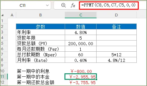 函数功能:计算某一期还款额中的本金函数语法:=PPMT(各期利率, 指定的期数, 总付款期数, 贷款本金, [未来值], [付款时间])应用公式:计算第1个月还的这笔钱本金有多少