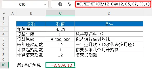函数功能:计算贷款在一段时间内累计支付的利息总额函数语法:=CUMIPMT(各期利率, 总付款期数, 贷款本金, 开始期数, 结束期数, 付款时间)应用公式:计算还贷第1年总共支付银行的利息