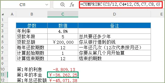 函数功能:计算贷款在一段时间内累计偿还的本金总额函数语法:=CUMPRINC(各期利率, 总付款期数, 贷款本金, 开始期数, 结束期数, 付款时间)应用公式:计算还贷第1年总共支付银行的本金
