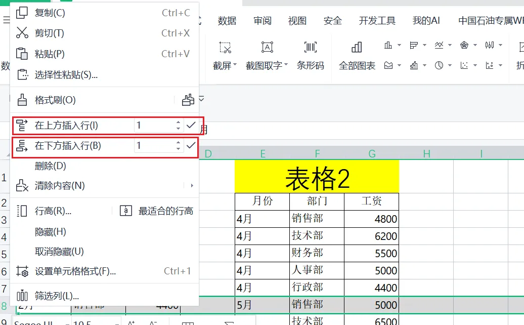 如果想给表格1插入一行还是多行,正常人的思维,选中某一行,单击鼠标右键,弹出对话框,选择插入几行,但是你会发现,两个表格同时插入,而不是某一个表格单独插入。正常的平时的操作: