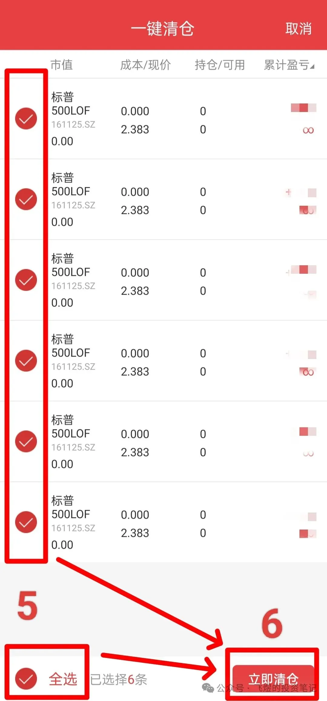 3.在一键清仓的界面中,勾选我们需要一键清仓的股票或者基金,然后点击【立即清仓】。下图展示的是笔者在做标普500LOF基金套利时的具体持仓,笔者在申购时使用了6个股东号,其中有3个深A股票账号和3个深A基金账号,所以卖出的时候,持仓里一共会有6笔投资。这里,笔者的持仓里只有这6笔投资,所以笔者只需勾选【全选】,再点击【立即清仓】。