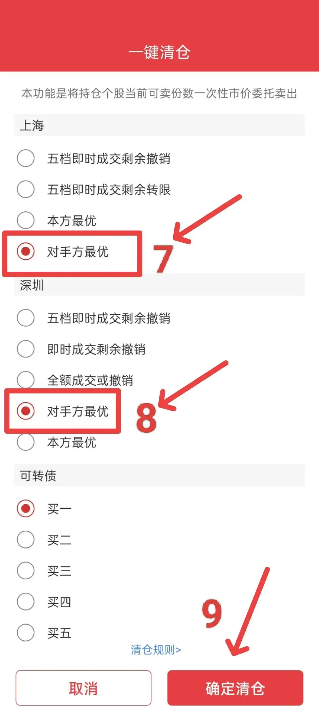 4.在【一键清仓】的功能选择界面里,选择具体挂单的方式,这里建议大家上海和深圳都选择【对手方最优】(即以“卖一价”卖出),然后点击【确定清仓】。