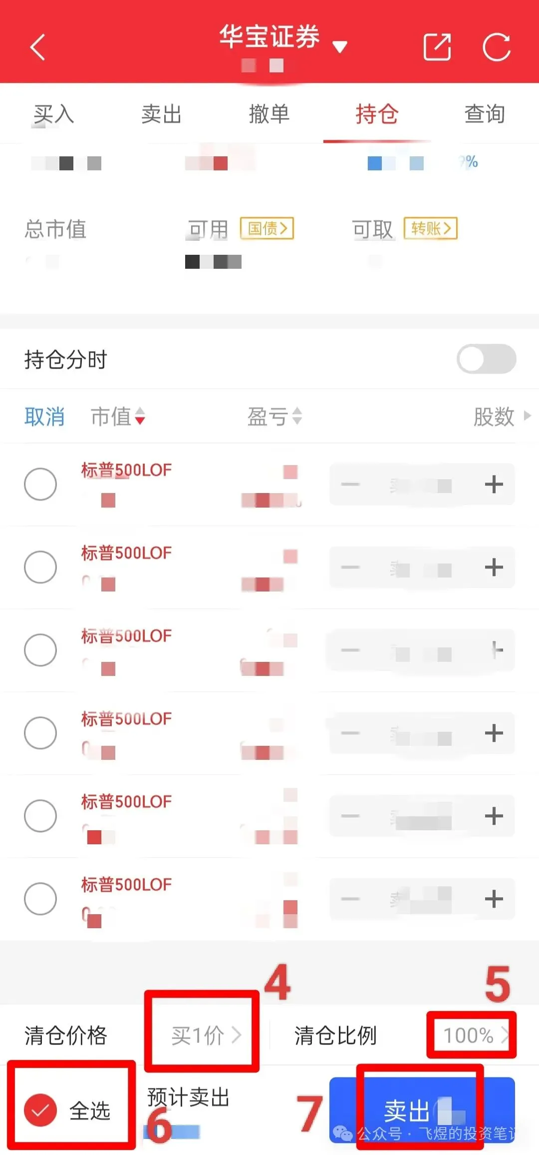 温馨提示:如果您的持仓里除了需要卖出的LOF基金,还有其他股票或者基金等不需要卖出的资产,那这一步最好别直接勾“全选”,最好是一个个点击选择,避免因误操作卖出你的其它持仓。
