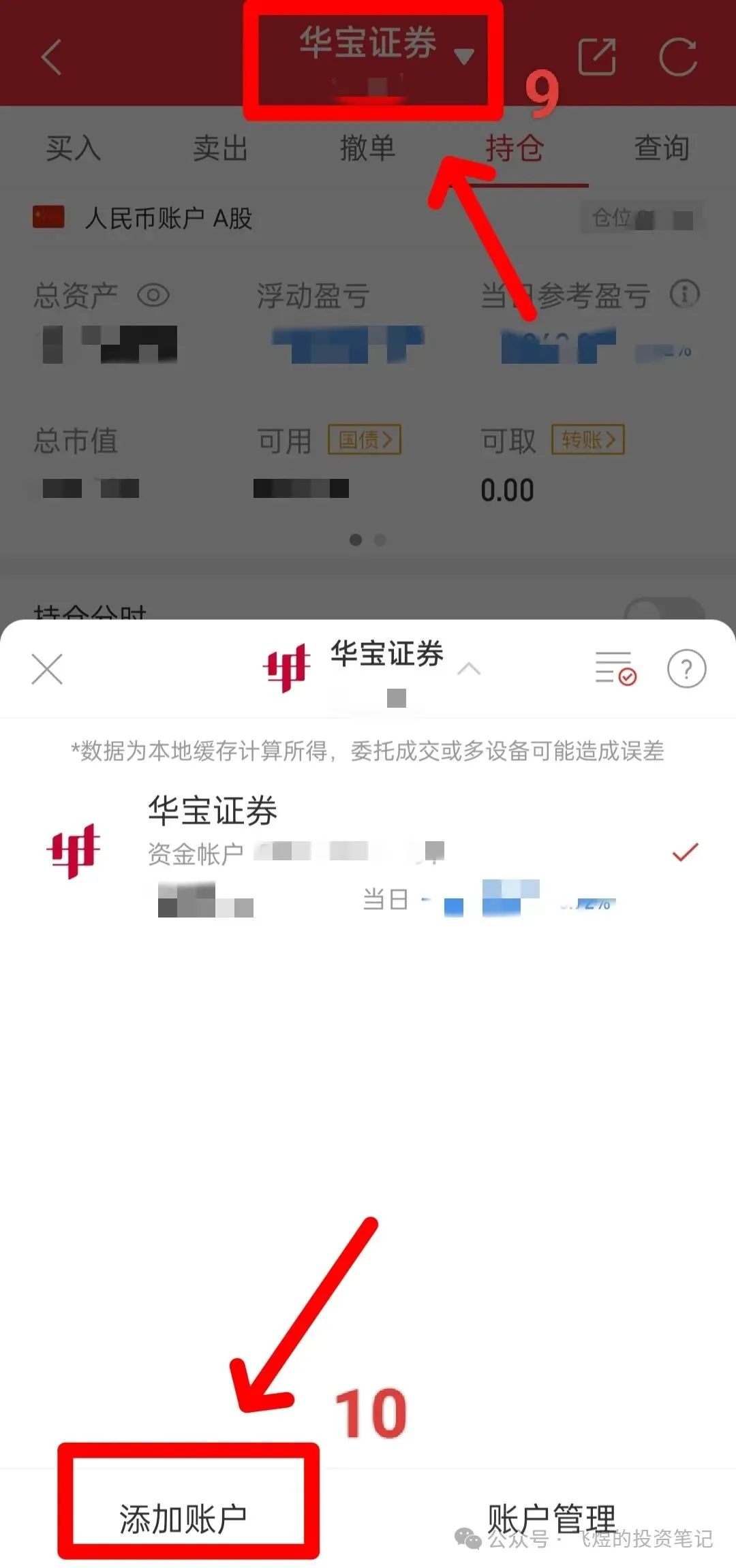 注:在第3步添加账户时,我们可以看到很多券商在里面,这也是像同花顺App这样第三方的股票交易软件强大的地方,它可以将很多券商集成在一起,更适合用多个券商交易的股民朋友。后续如果您想在同花顺里添加其他券商的账户,可以如下图所示,点击您的账户名称,然后弹出一个页面,在最下面点击【添加账户】,再按照前文第3至4步操作即可。
