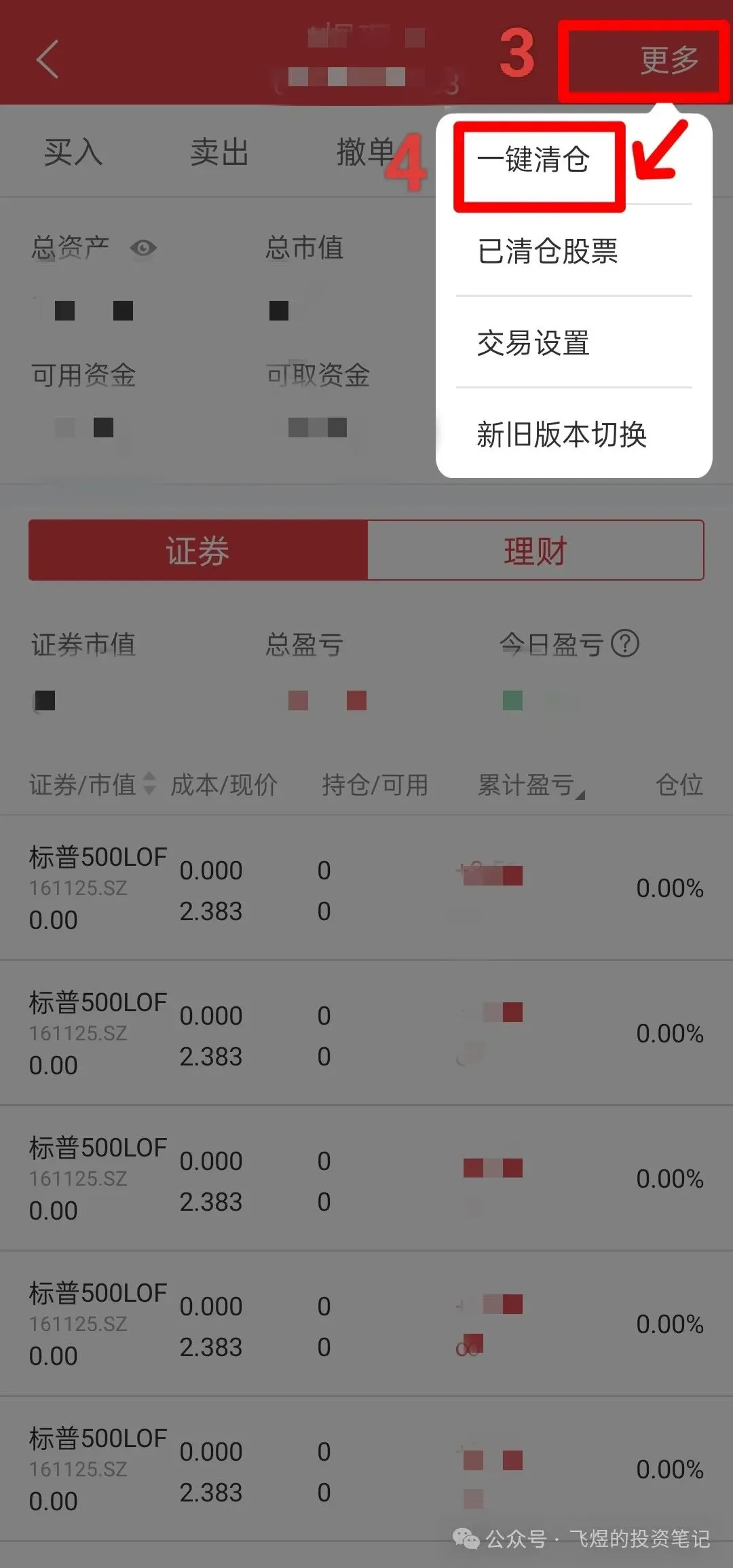 下面,我们以某券商的App为例,简单介绍一下【一键清仓】的操作方法(注:请读者以上图下文的顺序阅读)。