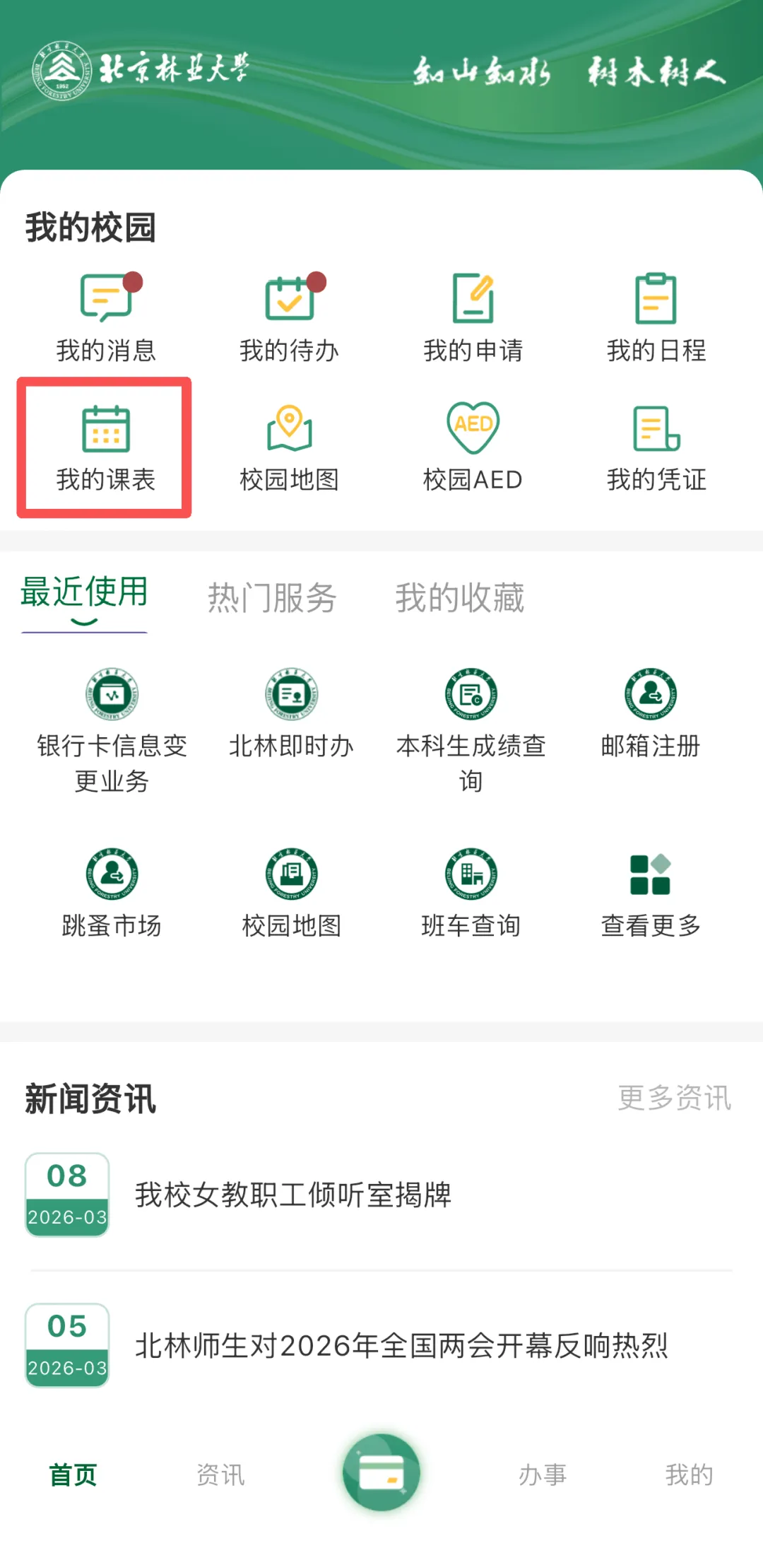 1、打开北京林业大学APP,首页即可看到「我的课表」入口,直接点击就能进入;