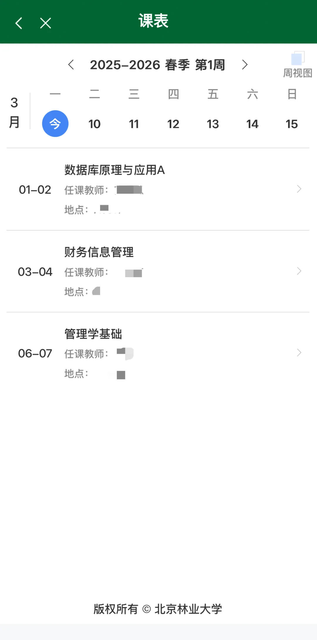 💡现在打开北京林业大学APP点击「我的课表」功能,老师和学生都可以查看对应课表,还有隐藏的日程提醒功能,助力大家解锁校园高效新模式!