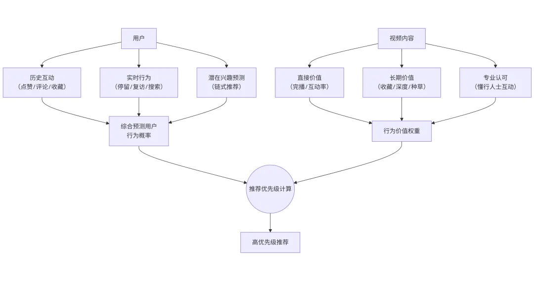 我们可以看到,新算法对视频本身的评估也更全面,不再只是回应用户“过去”喜欢什么,而是试图预测他们“未来”需要什么。它通过分析你的历史互动、实时行为(如是否看完、是否返回重复观看)以及更深层的兴趣线索(如搜索关键词),来综合判断你接下来可能对什么内容产生深度互动。