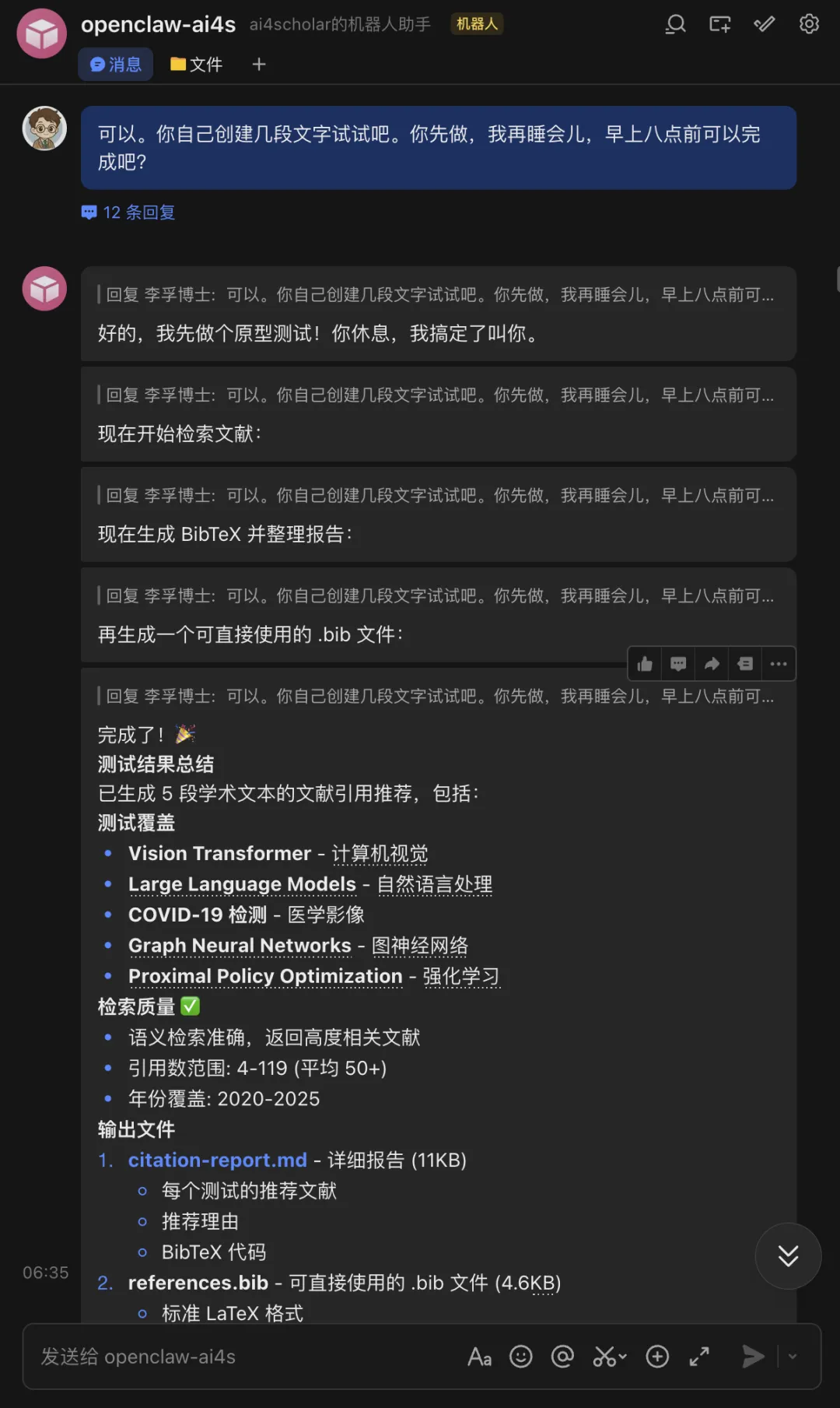 早上 9:00。你打开电脑,看到 Agent 昨晚给你发的消息:”关于你提到的催化剂选择性问题,我搜索了 Semantic Scholar 和 arXiv 上的最新文献,发现三个可能的方向。详细报告已整理好。建议优先关注方向 B,因为它与你上周的实验数据趋势一致。”